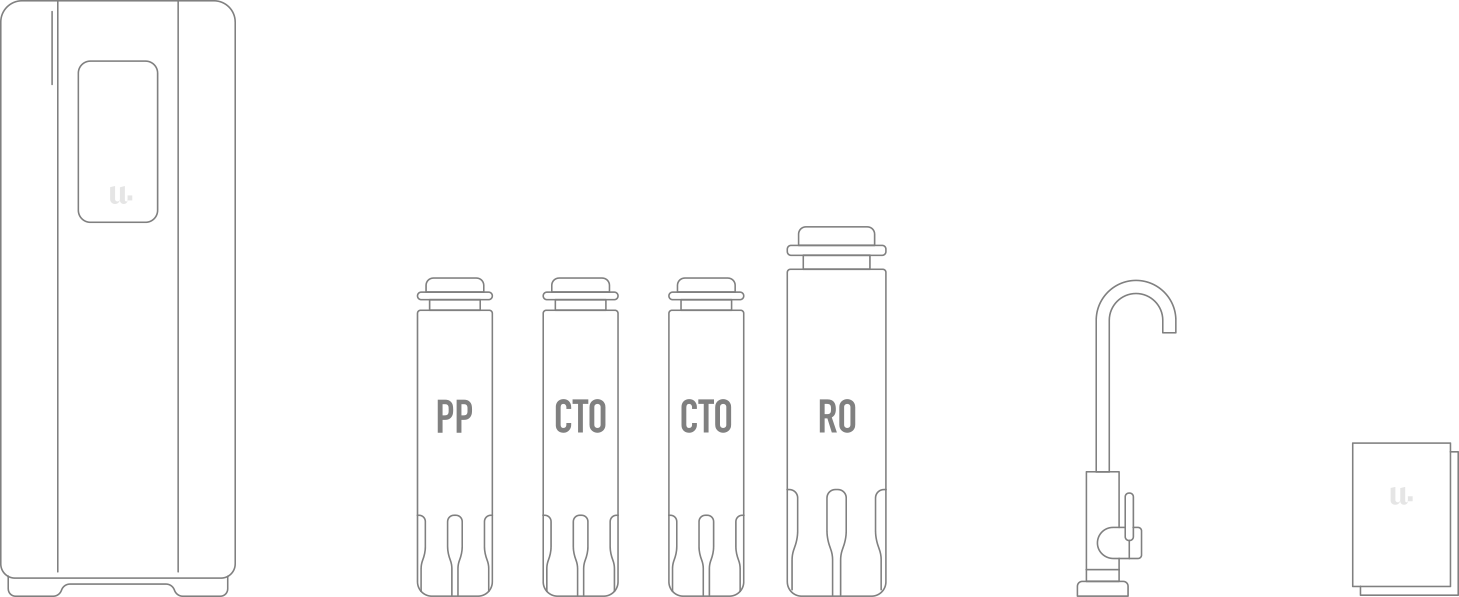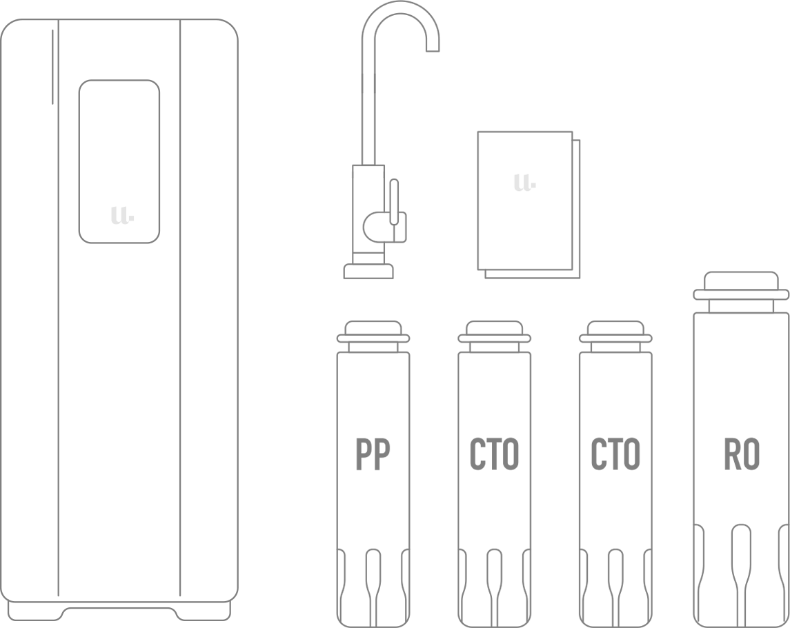 包含了凈水機主機和濾芯4只,pp棉濾芯 / cto前置活性炭濾芯 / cto后置活性炭濾芯 / ro反滲透膜濾芯